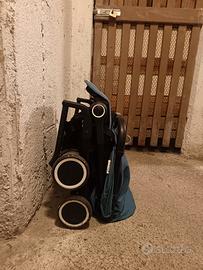 Passeggino richiudibile a libro dotato di cappottina con inserto in retina per maggiore areazione e controllo, cintura a 3 punti, ganci porta borsa, cinghia per il trasporto da chiuso, telo parapioggia e copertina invernale.