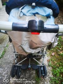 Passeggino Inglesina blu azzurro e grigio, con tettuccio parasole estivo grigio aperto dai lati (accessorio compreso ma non visibile nella foto). Oggetto che è stato usato, alcuni segni di deterioramento dovuti all'uso ma in buono stato di funzionamento.