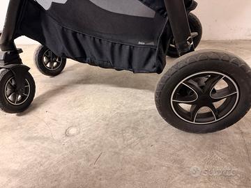 •Ruote ammortizzate, freno centralizzato, maniglione reversibile.