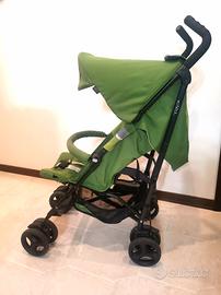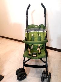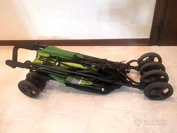 Passeggino leggero Inglesina Trip nella colorazione del verde con chiusura ad ombrello. Reclinabile. Dotato di comoda capottina con frontalino UPF50 e di barra di protezione, entrambe removibili. È inoltre presente il parapioggia. È adatto dai 6 mesi in su.