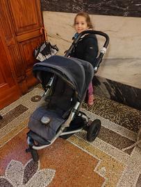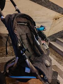 passeggino con ruote gonfiabili adatte a terreni sconnessi, struttura leggera ma robusta in alluminio, facile da ripiegare diventando compatto per trasporto in bagagliaio anche piccolo, con copertura regolabile, alloggiamento sotto per portare oggetti, freno per bloccarlo, e fornito di copertura impermeabile.