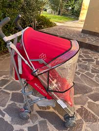 Passeggino Maclaren rosso, completo di para pioggia. Il passeggino ha segni di usura ma è ancora perfettamente funzionante.