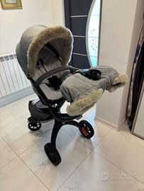 Passeggino Stokke navicella +sedia colore grigio scuro,navicella completa di protezione pioggia e zanzariera, la sedia completa di protezione pioggia, kit invernale con muffole e ricambio esterno completo, imbottitura per la sedia che può essere usata quando sono appena nati con la sedia in orizzontale, diversi accessori come la borsa, porta bicchiere, ombrello tutto originale Stokke.