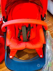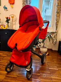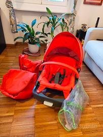 Stokke Xplory rosso completo - navicella e passeggino color rosso (Ruby Red). Include sia la culla che il passeggino/seduta, più sacco termico imbottito, parapioggia, borse portaoggetti, ombrelli originali e adattatori. Dalla nascita fino a 22 kg (passeggino), altezza seduta ergonomica fronte mamma/mondo, ruote piroettanti 360° per scale e marciapiedi, capottina estensibile UPF50+. Materiali Stokke premium, sfoderabili e lavabili a 30°, usato con massima cura da famiglia non fumatori, ceduto lavato in tutte le sue componenti. Valore nuovo oltre 1200€. Solo ritiro a Torino zona Crocetta, no spedizioni.