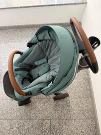 Vendo bellissimo passeggino Stokke Xplory nell'esclusiva colorazione verde acqua/salvia con eleganti dettagli in ecopelle marrone sul maniglione e sulla barra di sicurezza. Il design iconico regolabile in altezza permette di tenere il bambino vicino a sé e di usarlo come seggiolone al ristorante.