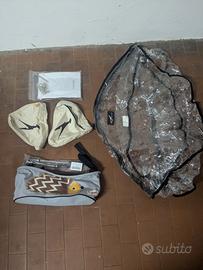 Abbiamo sia la navicella per i neonati, che gli inserti per l'ovetto, che il passeggino per bimbi piu grandi. Ampio spazio di carico sotto, laccio da mettere al polso per sicurezza, freno ancora ben funzionante. Abbiamo anche il copripioggia, una coperta per la navetta, e vari accessori.