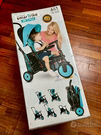 La ruota anteriore ha due modalità per lasciare il controllo direzionale al bambino o all’adulto. Lo smarTrike STR3 6 in 1 è stato progettato per aiutare il bambino a sviluppare le capacità motorie, la sicurezza, e l'equilibrio mentre impara ad andare sul triciclo in modo indipendente. È dotato di un sistema frenante controllato dai genitori, un'imbracatura regolabile a 5 punti e un ammortizzatore brevettato per tenere il bambino ben allacciato. Si piega in maniera molto compatta (come si vede sulla confezione originale).