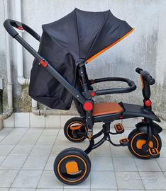 Passeggino/triciclo Nunu baby go nero è un Triciclo con cappottina e cestino portaoggetti anteriore e posteriore. Dotato di un manico a passeggino regolabile in altezza e ribaltabile in posizione frontale o posteriore rispetto al bambino, riesce ad essere un divertente triciclo per i bambini e allo stesso tempo un comodo veicolo per portare in giro più piccoli. Tessuto parasole regolabile. Campanello con melodie preimpostate. Poggiapiedi retraibile. Blocco ruote posteriori. Possibilità di scollegare la ruota anteriore dai pedali. Ammortizzatore centrale. Cinture di sicurezza regolabili Ruote piene diametro 21.5 cm, spessore 5 cm. Altezza seduta regolabile in due posizioni: quella massima è 38 cm. Altezza manubrio regolabile fino ad un massimo di 60 cm dal suolo. Larghezza sella 22 cm. Lunghezza schienale 36 cm. L’articolo è nuovissimo, mai e dico mai usato.