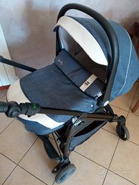 CARROZZINA Dotata di sistema di aggancio/sgancio rapido Quicky System, con maniglione antiribaltamento, Schienale reclinabile in 3 posizioni, Copertina utilizzabile come copertura per le gambe nella funzione passeggino, Materassino, Ampia capottina e morbida copertina con alzatina frangivento, Fondo aerato, Borsa