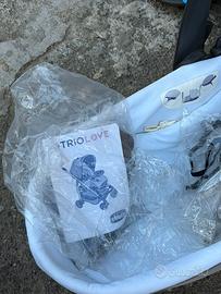 “Vendo trio Chicco Trio Love usato pochissimo, perfetto per neonato. Inclusi: passeggino pieghevole con una mano, navicella morbida con telo, ovetto con base Isofix (Airbag ok), sacco coprigambe invernale beige, borsa cambio. Tutto lavabile, chiusura compatta, ruote buone. Solo graffietti leggeri da uso normale—niente danni. Foto reali, lo vedi aperto, chiuso, interni puliti. Prezzo 150€ trattabili, ritiro a o spedizione (costo extra). Chiedi pure!”
