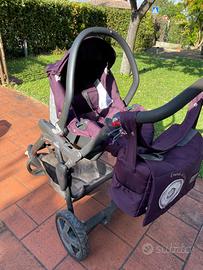 Trio CAM dinamico color vinaccia, dotato di ovetto,con riduzione per neonati piccoli piccoli, carrozzina e passeggino, con borsa da attaccare alla maniglia attrezzata con telo per cambio pannolino. Ruote posteriori gonfiabili con la pompa per le ruote della bicicletta. In aggiunta telo antipioggia per passeggino e zanzariera da carrozzina.