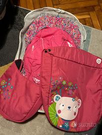 Vendo Trio Tuc Tuc. Comprensivo di base con portaoggetti nero; navicella con capotte nera dei pirati e coprigambe fuxia kimono; ovetto con capotte nera dei pirati, coprigambe fuxia kimono, riduttore per neonati e imbottitura per l'inverno fuxia kimono; passeggino con capotte nera tinta unita e spartigambe fuxia. Presente anche incerata antipioggia per l'ovetto e per la navicella. Il peso della base è 15 kg, si toglie la seduta del passeggino per inserire navicella e ovetto e quindi resta più leggero di altri trio. La base si piega fino a diventare piatta, comoda da mettere nel portabagagli. Anche la navicella si piega completamente fino a diventare piatta, presente materassino sottile.