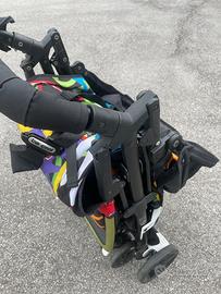 La guida è fluida e scorrevole grazie alle 4 ruote di cui le anteriori piroettanti, freno a pedale e maniglione unico, dalla finitura abbinata al tessuto stile geaffiti molto moderno.