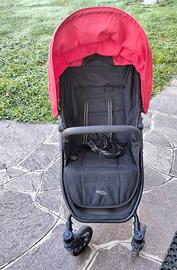 Ruote resistenti, cappottina rossa e cestello portaoggetti capiente.