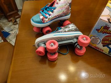 Pattini a rotelle con un design scintillante e colorato. - Toma alta. - Paillettes iridescenti. - Lacci blu vivaci. - Dettagli glitterati sulle punte.