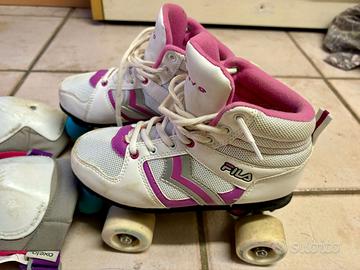 Vendesi causa inutilizzo, nessun difetto se non di usura, perfettamente funzionanti. Marca FILA, numero 37. Incluso con i pattini anche set protezioni composto da ginocchiere (un po’ rovinate dalle cadute ma nessuna rottura) e gomitiere (condizioni pari al nuovo).