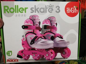 Pattini allungabili bambina misura piede 26-30. Usati poche volte, ottime condizioni, non segni di usura. In regalo confezione di protezioni per ginocchia, gomiti e mani taglia 3/7 anni. No spedizione.