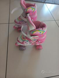 Vendo nuovissimi pattini da bambina, taglia 34-37, appunto veramente intatti, siccome la bimba l'ha indossati per poco tempo, poi è cresciuto il piede quindi non più efficaci, molto deliziosi in quanto di ottima marca Weskean, ruote luccicanti di vari colori in fase di rotolamento, punte dei pattini con brillantini, doppia chiusura ermetica al piede. Il prezzo è interessante di soli 25 euro, pagate circa 59,90 euro lo scorso anno.