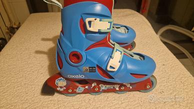 Questi sono un paio di pattini in linea regolabili del marchio Oxelo (distribuito da Decathlon), specificamente progettati per i bambini principianti che si approcciano al mondo del pattinaggio.🎯 Caratteristiche PrincipaliTaglia Regolabile: Il dettaglio sulla scarpetta indica la misura 34-36 (215-225). La caratteristica principale di questi pattini è la possibilità di regolare la misura su 3 taglie intere (in questo caso da 34 a 36) per seguire la crescita del piede del bambino, rendendoli durevoli nel tempo.Colore e Design: Presentano un design vivace, principalmente blu e rosso, con dettagli in plastica e cinghie di chiusura di un colore verde acqua/celeste molto chiaro. Il telaio (frame) è rosso ed è decorato con grafiche giocose e stilizzate (personaggi/figure) che attraggono il pubblico più giovane.Ideali per Principianti: Questi modelli Oxelo sono dotati di cuscinetti che offrono una scorrevolezza controllata e una velocità limitata, perfetta per i primi approcci e per migliorare la motricità e l'equilibrio in sicurezza. Dettagli Strutturali e ComfortScocca Rigida (Shell): Il guscio esterno è in plastica (spesso Polipropilene), offrendo un buon sostegno alla caviglia e al piede, fondamentale per la stabilità dei principianti.Chiusura: Il sistema di chiusura è progettato per essere semplice ed efficace, di solito composto da:Una fibbia micrometrica in alto sulla caviglia per un serraggio preciso e un ottimo sostegno.Una cinghia in velcro sull'area del collo del piede per fissare bene il tallone.(In alcuni modelli, lacci sulla scarpetta interna, sebbene su questi non siano visibili nella parte esterna).Scarpetta: La scarpetta interna è in schiuma (imbottita), garantendo un comfort accogliente e spesso è amovibile per la pulizia.Ruote e Freno:Montano 4 ruote in linea (rollerblade). Le ruote e il freno sono realizzati in gomma (Poliuretano) anziché in PVC, per una migliore aderenza e un'usura meno rapida