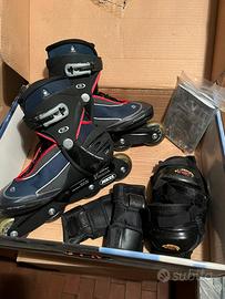 Pattini in linea regolabili Misure tra 36 e 40 Con protezioni ginocchia, gomiti e polsi Ritiro sul posto