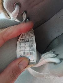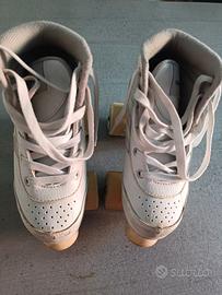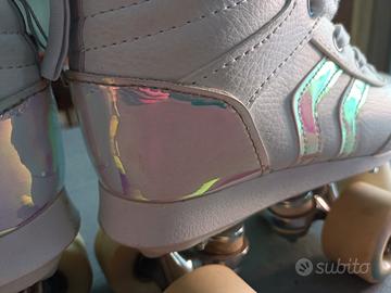 Vendo, come da foto, pattini a rotelle, marca Oxelo della Decathlon. Modello: Quad 100 JR White olographic. Colori: bianco e dettagli olografici arcobaleno che cambiano colore a seconda della luce. Taglia EU 32. Ideali e sicuri per chi vuole iniziare a sperimentare i pattini. Struttura a scarponcino alto per sostenere le caviglie. Freno anteriore in ottime condizioni. Nel set sono compresi: il borsone apposito color viola e nero dotato di tracolla e le protezioni, praticamente nuovi! NB. Paracolpi - gomiti, mani, ginocchia - taglia XS, dai 25 ai 50 kg, dai 6 ai 10 anni (ma vanno bene anche per prima). Possono essere usati come anticaduta per: pattini, skate e monopattini (volendo, alcuni pezzi, anche per la bicicletta). Usato in buono stato, pronto per l'utilizzo. Euro 40. No perditempo, spedizione disponibile con TuttoSubito a carico dell'acquirente, grazie.