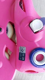 Pattini in linea da bambina marca Oxelo – modello Play 3, colore rosa e viola. Taglia regolabile 26–28. Possibilità di trasformarli da in Linea a 2 ruote posteriori per l'equilibrio.