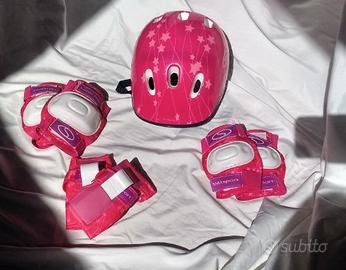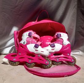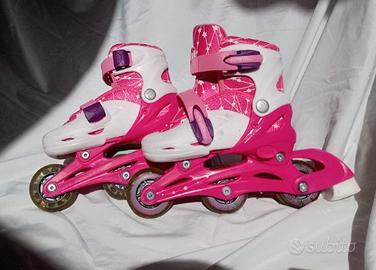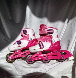 Pattini rosa con tutte le attrezzature. Ruote che si illuminano, e si possono mettere sia in file che a due a due. con un pulsante si possono rimpicciolire e ingrandire. Misura 25-28.