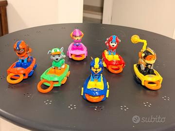 Personaggi paw patrol con mini veicoli. Tutti finzionanti con lancio del salvagente. Ogni veicolo lqncia il suo salvagente. Si vende come in foto.