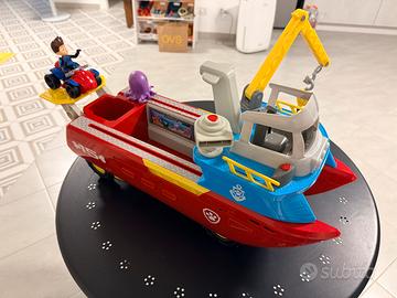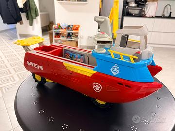 Nave paw patrol con personaggi, polpo, ancora e veicolo raider. Ottime condizioni. I meccanismi di trasformazione e movimento finzionano perfettamete. La nave si trasforma facendo uscire le ruotew divendando in veicolo da sbarco.