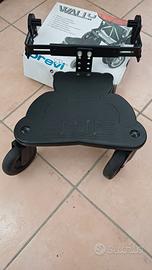 Pedana per il trasporto del secondo bambino in piedi con aggancio universale a tutti i modelli di passeggino. Modello e marca: Brevi Wally. Completo di accessori e scatola Per bambini dai 15 mesi / fino a 20 kg. Applicabile a passeggini e carrozzine dotati di asse, traversa o tubo rigido posteriore con diametro massimo di 45 mm. Struttura regolabile in altezza e in larghezza per adattarsi alle dimensioni del telaio del passeggino. La base d’appoggio della pedana è a 16 cm dal suolo. Per bambini dai 15 mesi e con peso inferiore ai 20 kg.