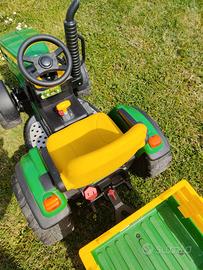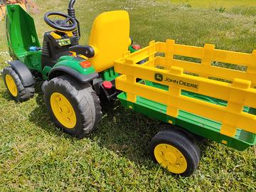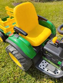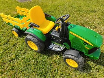 Vendo trattore elettrico Peg Perego John Deere Ground Force (modello originale su licenza), completo di rimorchio a sponde rimovibile. Il gioco è in ottime condizioni generali, perfettamente funzionante e sempre tenuto al riparo. A Dicembre 2025 è stata sostituita la batteria originale con una NUOVA BATTERIA POTENZIATA da 12 Ampere (più potente dell'originale). Questo significa un'autonomia di gioco molto maggiore per lunghe passeggiate senza soste. Caratteristiche Principali: Alimentazione: 12 Volt (batteria maggiorata e caricabatterie inclusi). Marce: 2 marce avanti (la seconda è bloccabile per i principianti) + Retromarcia, con robusto cambio a leva centrale. Guida facile: Pedale acceleratore unico che funge anche da freno automatico una volta rilasciato. Comfort: Sedile con braccioli, regolabile in diverse posizioni per seguire la crescita del bambino. Intrattenimento: Vano passeggero spazioso e Radio FM funzionante integrata nel cruscotto. Accessori: Rimorchio a sponde alte incluso, facilissimo da agganciare e sganciare. Stato: Battistrada delle ruote in ottime condizioni per un'ottima trazione anche su prato o terreni sconnessi. Le foto mostrano chiaramente le ottime condizioni plastiche, il battistrada e il vano motore pulito con la nuova batteria installata. Il caricabatterie fornito non è l'originale ma una versione compatibile perfettamente funzionante. Non spedisco per via delle dimensioni, solo ritiro a mano in zona (Montecastrilli - Terni). Disponibile per prova e visione di persona. Contattatemi per maggiori info.