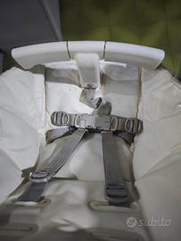 Il rivestimento originale in ecopelle presenta macchie da utilizzo che non sono andate via con il lavaggio. La sacca viene consegnata insieme al seggiolone, ma si consiglia la sostituzione per motivi estetici e igienici.