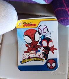 Vendesi splendido peluche di Ghost-Spider (Gwen Stacy), direttamente dalla serie di successo Disney Junior "Spidey e i Suoi Fantastici Amici". Il peluche è nuovo con cartellino originale, perfetto come regalo o per completare una collezione Marvel. Realizzato con materiali di alta qualità, è estremamente morbido al tatto e presenta dettagli ricamati accurati (niente parti in plastica dura, quindi sicuro anche per i più piccoli). Personaggio: Ghost-Spider / Gwen Stacy. Altezza: circa 40 cm (versione grande). Condizioni: Nuovo con etichette. Caratteristiche: Colori vivaci (bianco, viola e rosa), dettagli della ragnatela sotto le braccia e cappuccio integrato. Prodotto ufficiale con licenza Marvel/Disney. Ideale per bambini amanti dei supereroi o per decorare una cameretta a tema Spider-Man.
