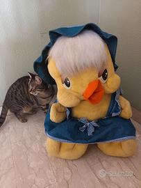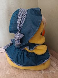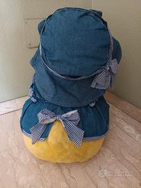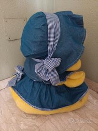 Peluche gigante a forma di pulcino o canarino, alto circa 60 cm. Con sottanina e cappellino in tessuto denim e fiocchetti in cotone. Molto carino come regalo per Pasqua. Usato, ma ancora in perfette condizioni. #peluche #gigante #pulcino #canarino #becco #Titti #sottanina #cappellino #vestito #fiocchetti #contadina #denim #jeans #cotone #blu