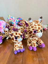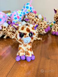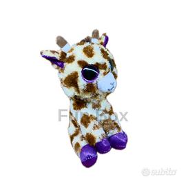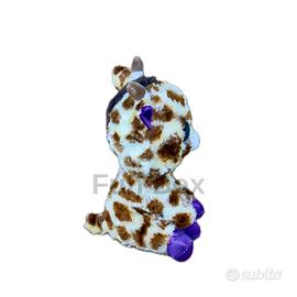Adorabile mini giraffa peluche 15cm. Morbidissima, con macchie marroni e dettagli viola. Caratterizzata da grandi occhi brillanti. Perfetta per bambini/e e collezionisti.