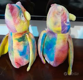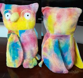 Coppia di gufetti in peluche con un vivace design arcobaleno.