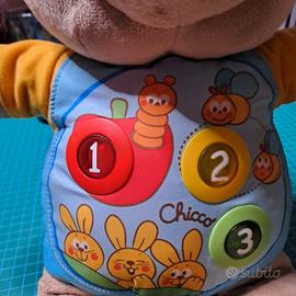 Peluche interattivo Chicco Teddy Conta Con Me, un simpatico orsetto che aiuta i più piccoli a imparare. - Orsetto in peluche morbido. - Dettagli colorati sul pancino. - Immagini di insetti e coniglietti. Funzioni: Gioco bilingue (italiano/inglese) che insegna numeri, parole, frutti e animali. Caratteristiche: Dispone di 3 pulsanti luminosi sulla pancia e diversi punti di interazione su mani e piedi. Interazione: Se capovolto, l'orsetto ride e interagisce col bambino. Età consigliata: Adatto a bambini a partire dai 6 mesi.