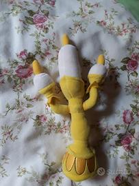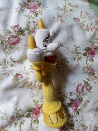 Pupazzo vintage di peluche di Lumiere de La Bella e La Bestia (Beauty and the Beast). La base è leggermente più pesante per tenerlo in piedi. Purtroppo non ha più l'etichetta (è stata tagliata), ma è stato acquistato al Disney Store di Disneyland Paris. Altezza: circa 25 cm.