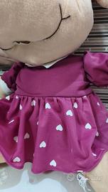 Indossa un elegantissimo vestito viola con cuoricini bianchi e fiocco coordinato.