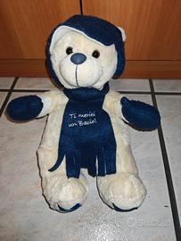 Orsetto di peluche con sciarpa, cappello e guanti blu. Sulla sciarpa è presente la scritta ricamata "Ti meriti un Bacio!".