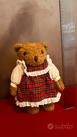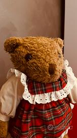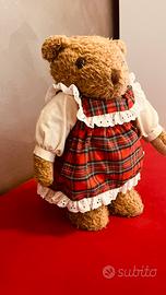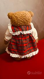 Vendesi dolcissimo orsetto di peluche da collezione o da regalo, caratterizzato da un look classico e intramontabile. Perfetto per arredare una cameretta in stile shabby chic o come compagno di giochi. Pelo morbido e riccio. Indossa un delizioso vestitino in fantasia tartan, arricchito da una camicetta bianca con maniche a sbuffo e rifiniture in pizzo sangallo sia sul colletto che sull'orlo.