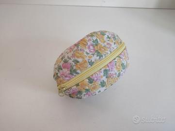 Simpatico peluche a forma di pulcino giallo con fiocchetto, completo del suo "uovo" protettivo in stoffa con fantasia floreale e chiusura a zip.