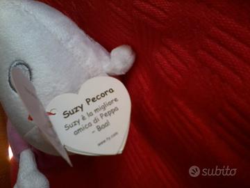 -Peluche pecora Suzy ORIGINALE alta circa 15 cm(personaggio della serie Peppa Pig) NUOVA DA NEGOZIO CON CARTELLINO ROSSO CON BORDI DORATI A FORMA DI CUORE MARCA TY a 10,50 euro.