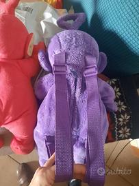 2 peluches teletubbies con tasca circa 40 cm, quello viola dotato di cinghie per zainetto.
