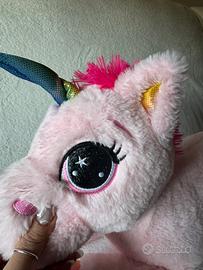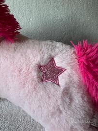 Morbido peluche gigante a forma di unicorno. Il suo colore rosa lo rende un'aggiunta vivace a qualsiasi collezione. - Dettagli color arcobaleno sulle zampe e sul corno. - Criniera e coda fuxia. - Stella e occhietti scintillanti. Lungo 54cm come si vede in foto. Interamente morbido, no parti rigide.