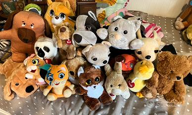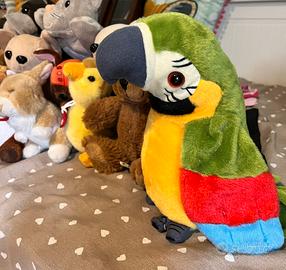 Vendo 18 peluches come in foto in perfette condizioni causa inutilizzo. Il pappagallo peluche è parlante e ripete quello che gli si dice.