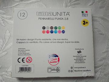12 Pennarelli colorati con punta resistente che non rientra, cappuccio ventilato e super lavabili!!! Indicati dai 3 anni in su. Marca "Tinta Unita". Nuovi!!!