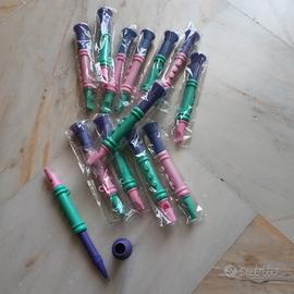 25 penne imbustate singolarmente. In plastica, 2 colori, con fischietto. Adatte a ricordino dopo compleanno.
