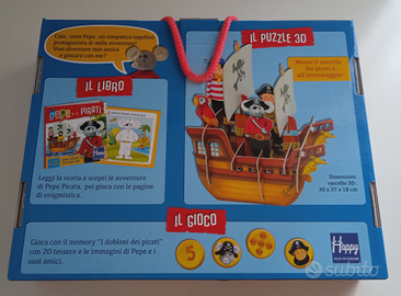 Nel libro sono descritte le avventure di un pirata in mezzo al mare, è presente un memory con cui giocare e un galeone da costruire. I pezzi sono in busta sigillata.