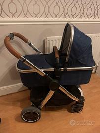 Set da viaggio Mothercare in blu. Include: telaio, seduta, navicella , adattatori per seggiolino auto, sacco nanna , parapioggia .